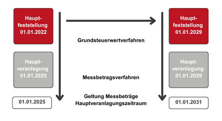 Der Grundsteuermessbetrag gilt bis zur nächsten Hauptveranlagung (aktuell bis 31.12.2030) und wird vom Finanzamt an die Gemeinde übermittelt.